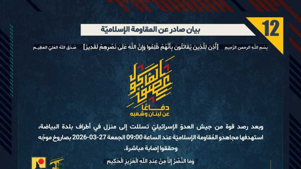 بيان صادر عن المقاومة الإسلامية (12): استهداف قوة من جيش العدوّ الإسرائيليّ تسللت إلى منزل في أطراف بلدة البياضة بصاروخ موجّه وحققوا إصابة مباشرة.