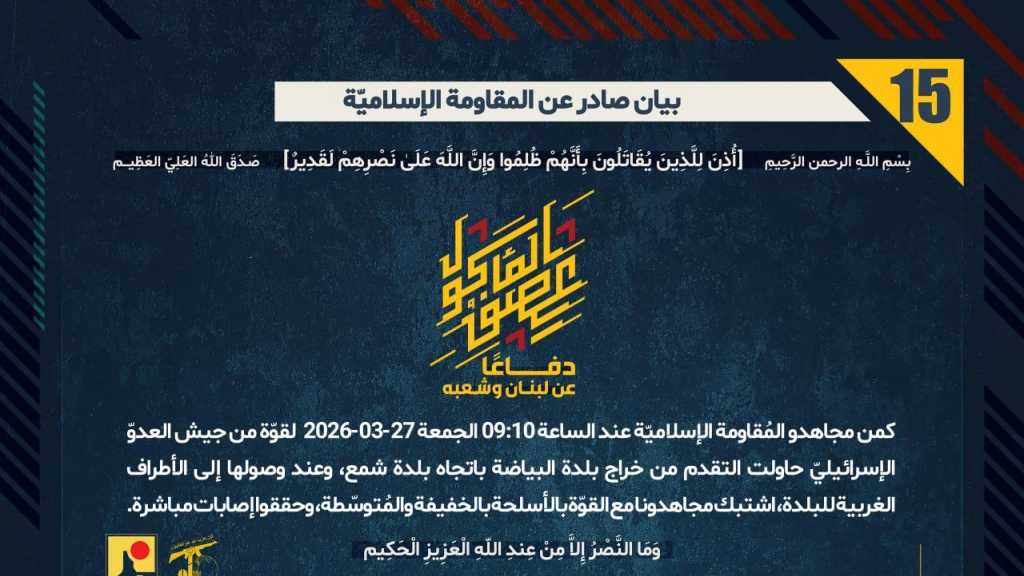 بيان صادر عن المقاومة الإسلامية (15): اشتباك مع قوة من جيش العدوّ الإسرائيليّ حاولت التقدم من خراج بلدة البياضة باتجاه بلدة شمع بالأسلحة بالخفيفة والمُتوسّطة، وحققوا إصابات مباشرة.